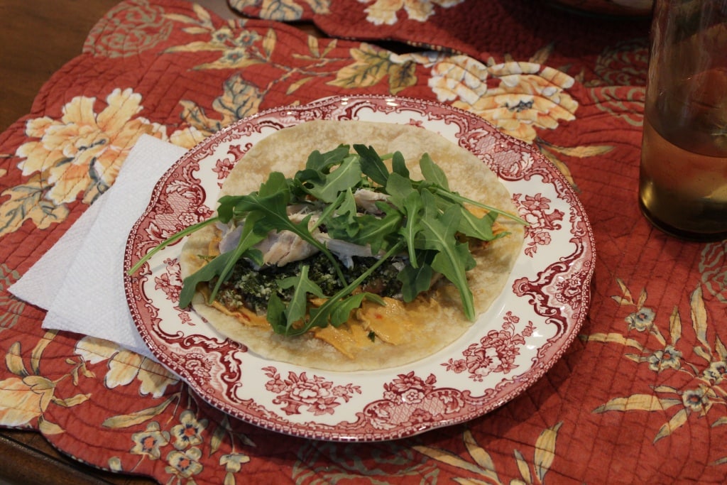 The other easy meal I’ve enjoyed a couple times this week is a chicken wrap with rotisserie chicken (see my post on 11 things to do with rotisserie chicken), tabouleh, hummus, and arugula. Yum!