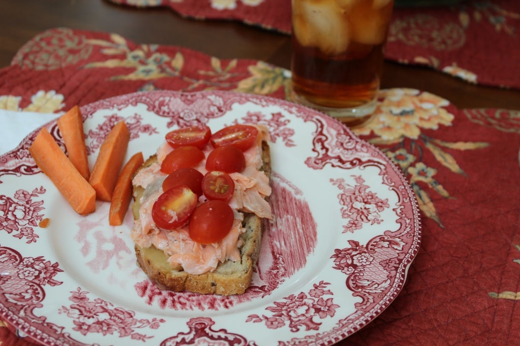 And then today for lunch I had open-faced cheese toast topped with leftover salmon and cherry tomatoes.