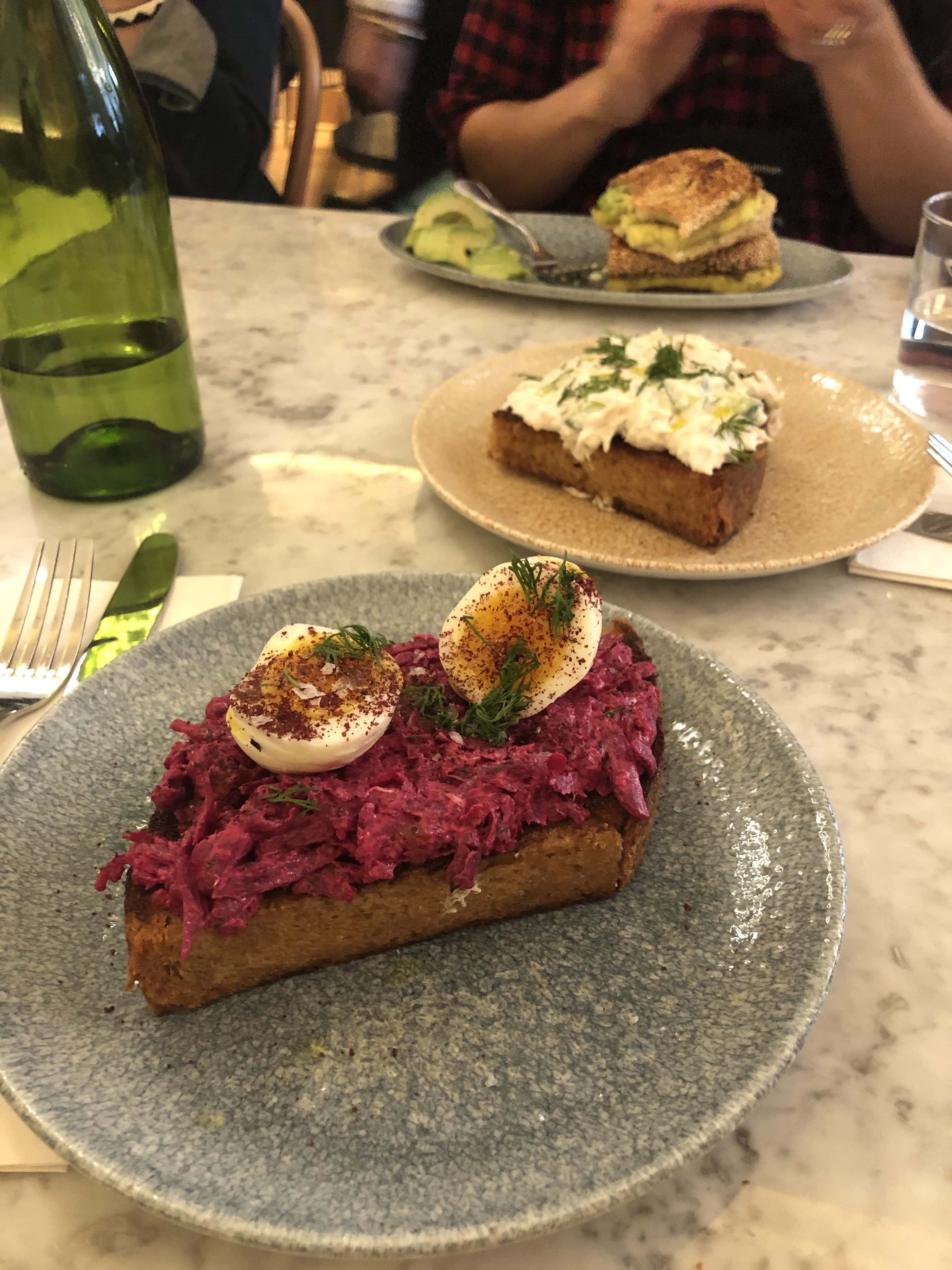 Other food highlights from the weekend included the toast at a cafe called K’far – I shared the smoked trout and beet toasts with my friend Alexis and both were awesome. The trout one had a little egg in a hole baked into the toast below – so creative!