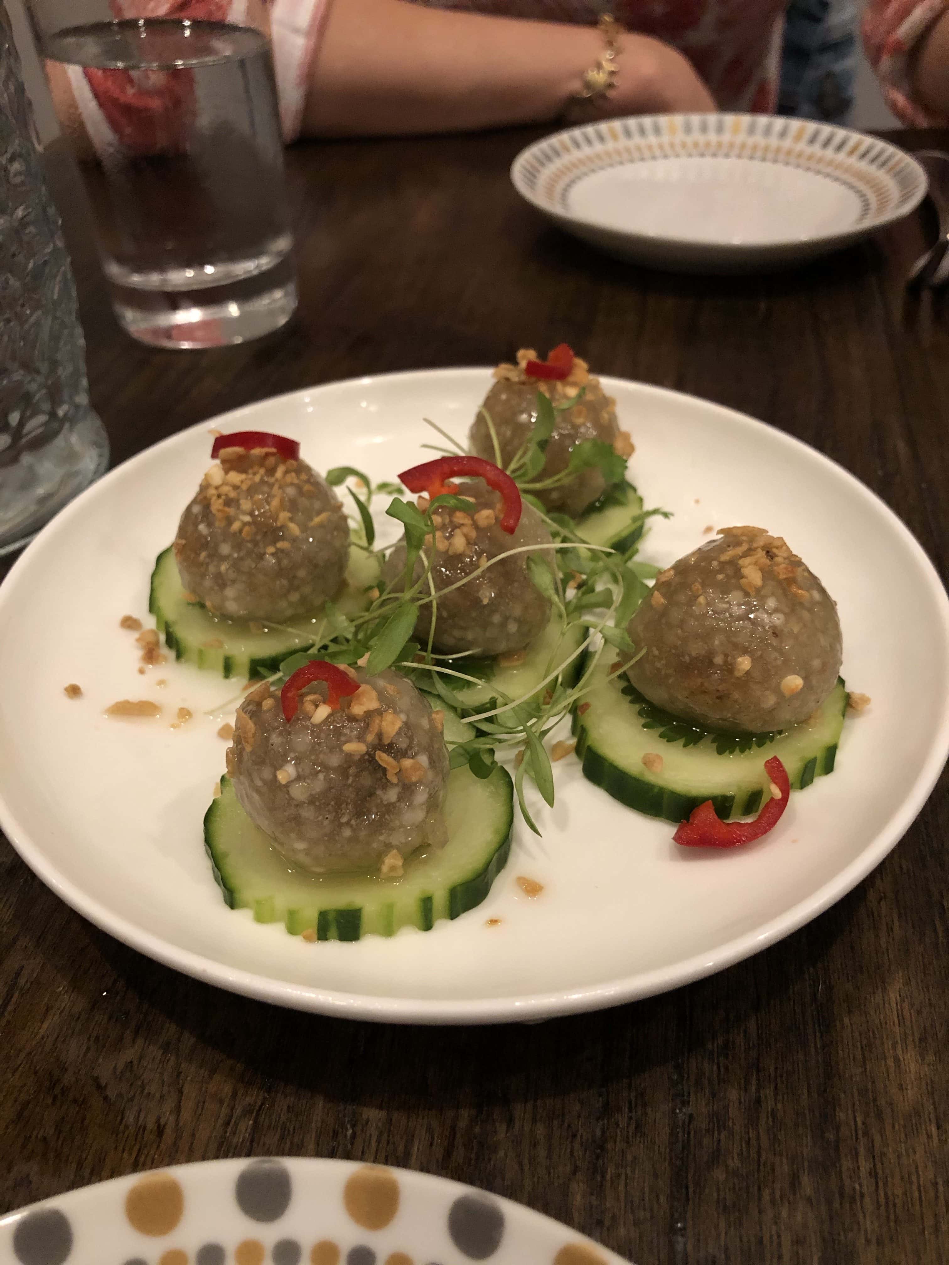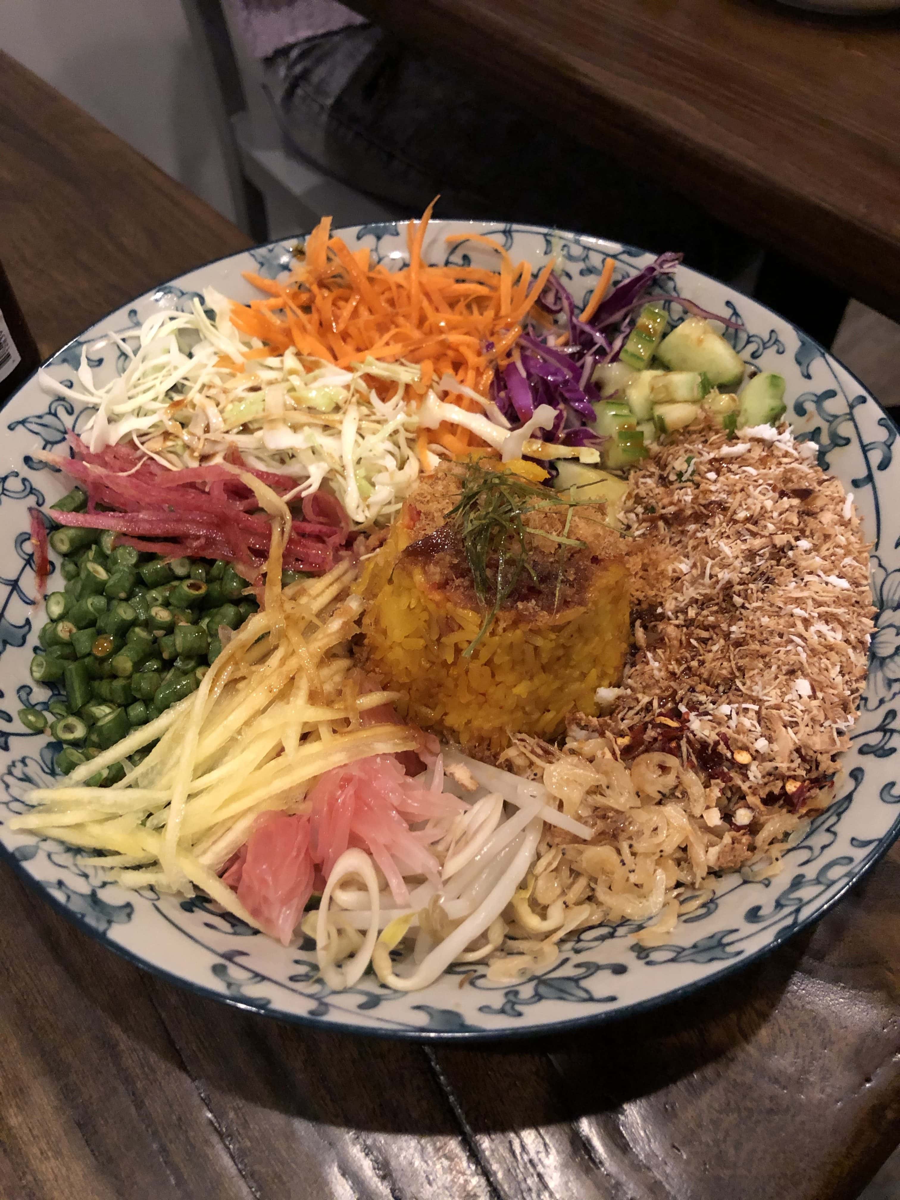 Next we shared the khao yum kamin – a southern Thai rice salad with toasted coconut, dried shrimp, chili flakes, seasonal vegetables, and fermented fish topped with a caramelized palm sugar dressing.